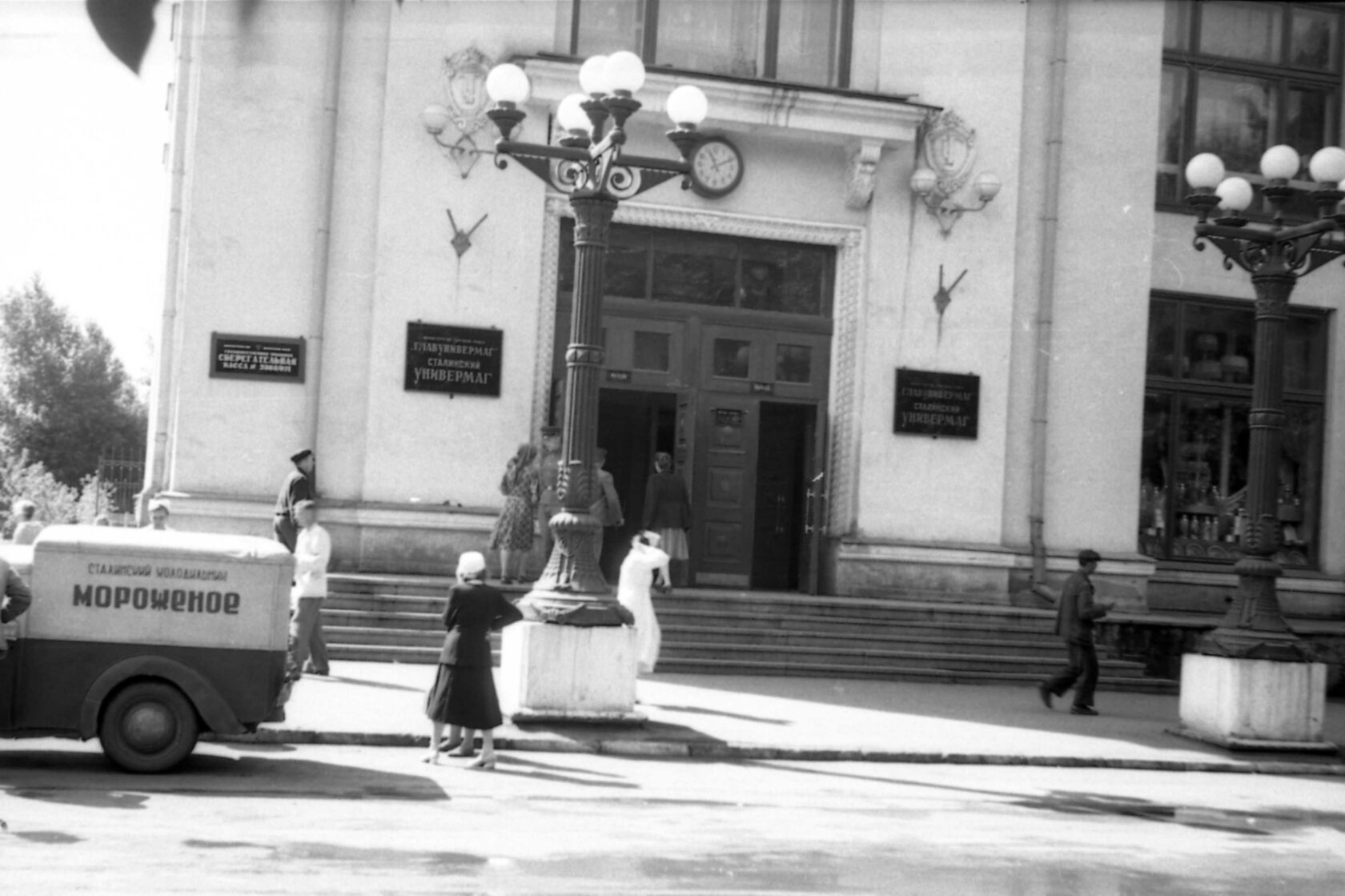 Закончить все работы успели до пресловутой «борьбы с излишествами», поэтому универмаг получился очень впечатляющим и красивым – как снаружи, так и внутри. Здесь очень много декора, включая великолепную лепнину, которой занимался знаменитый лепщик Кирилл Петрович Филиппов.