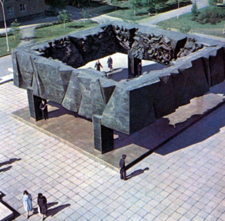Обрамляющая Вечный огонь конструкция представляет собой квадратную стелу на четырех гранитных столбах со скульптурным фризом, облицованным внутри скульптурным, а снаружи - декоративным рельефом.